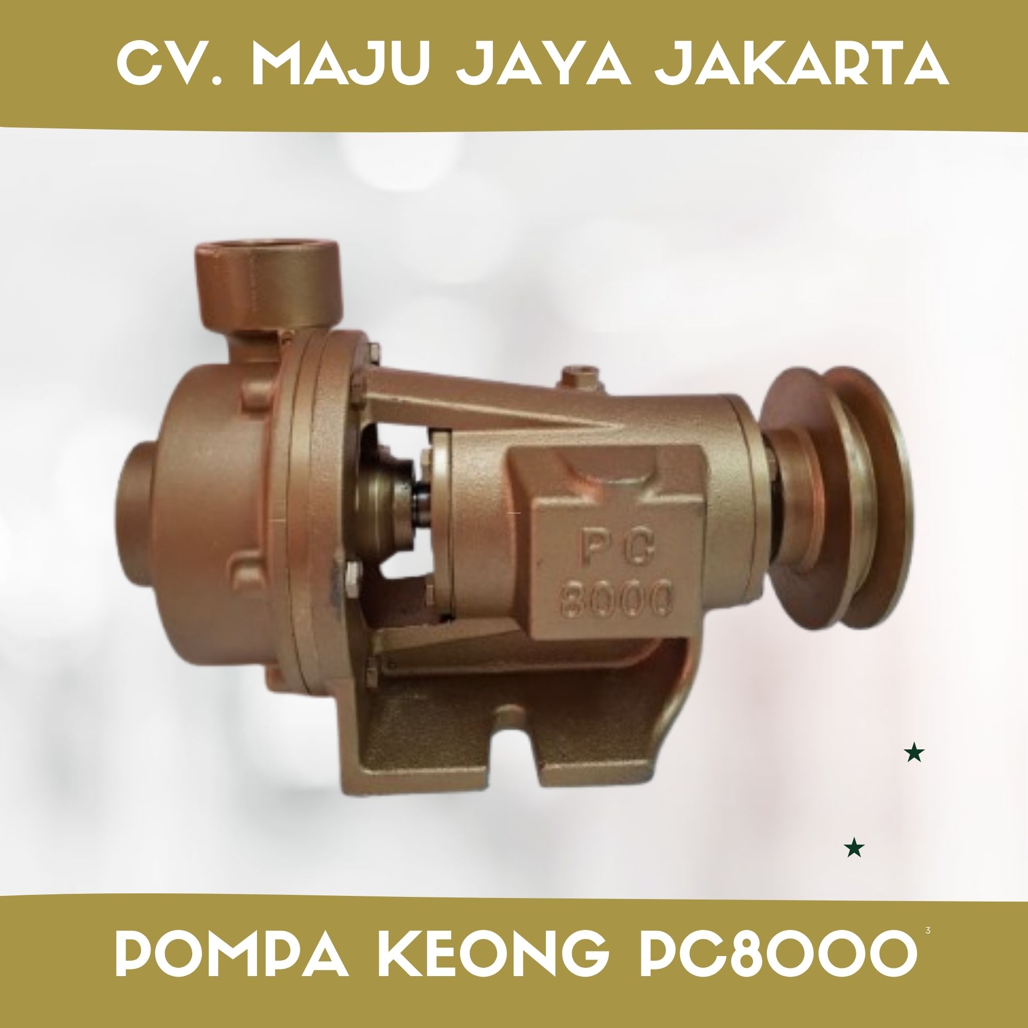 Water Pump PC8000 merupakan jenis pompa air tipe pompa keong (centrifugal pump) yang banyak digunakan dalam bidang industri, perkapalan, dan pertanian. Pompa ini umumnya dibuat dari bahan kuningan (brass) pada bagian penting seperti impeller dan housing, sehingga memiliki ketahanan tinggi terhadap korosi, terutama saat digunakan untuk air laut atau air payau.
